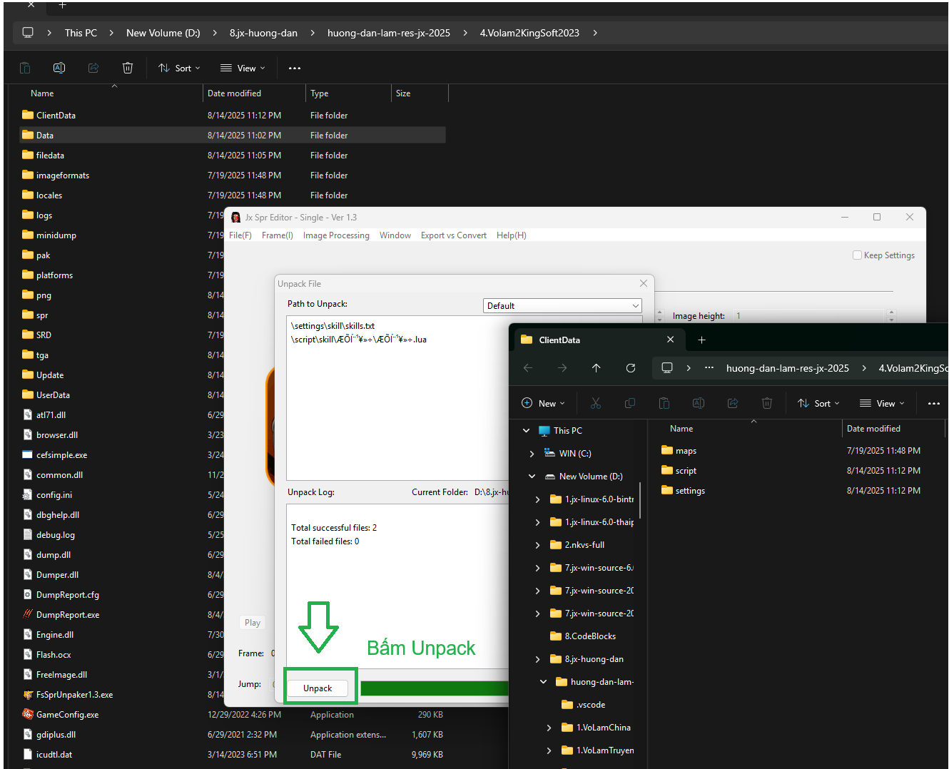 Bước 4: Quá trình unpack theo từng tập tin sẽ thông báo số thành công, số thất bại, kết quả nằm trong thư mục ClientData