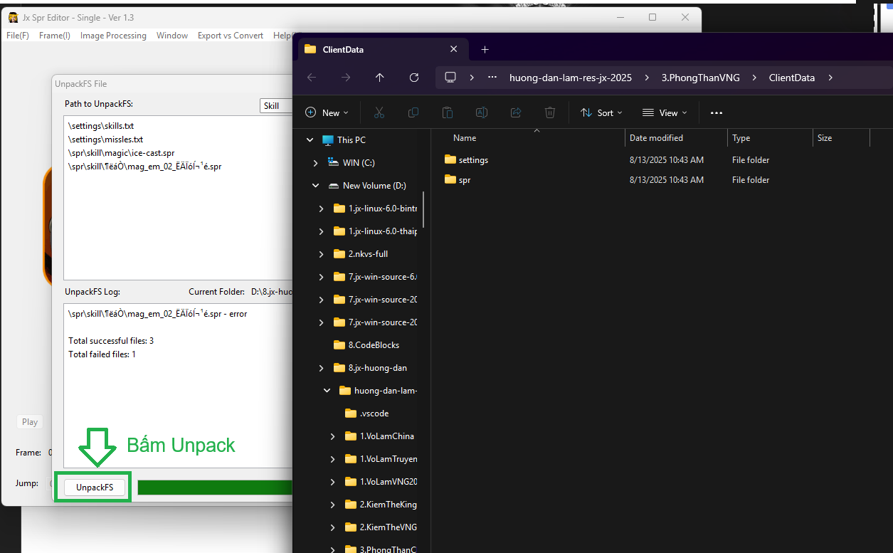 Bước 4: Quá trình unpack theo từng tập tin sẽ thông báo số thành công, số thất bại, kết quả nằm trong thư mục ClientData